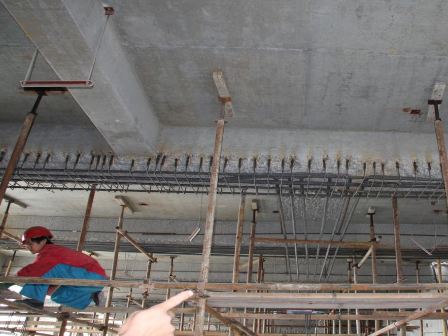 (9)增大截面加固法施工时原构件表面处理须满足相关规定,采用界面剂等剂料处理,这是为加强新、旧混凝土的粘结。施工过程中尽量减少原构件的负荷,或采用临时预应力支撑卸载,这也是决定加固效果的一个重要因素。